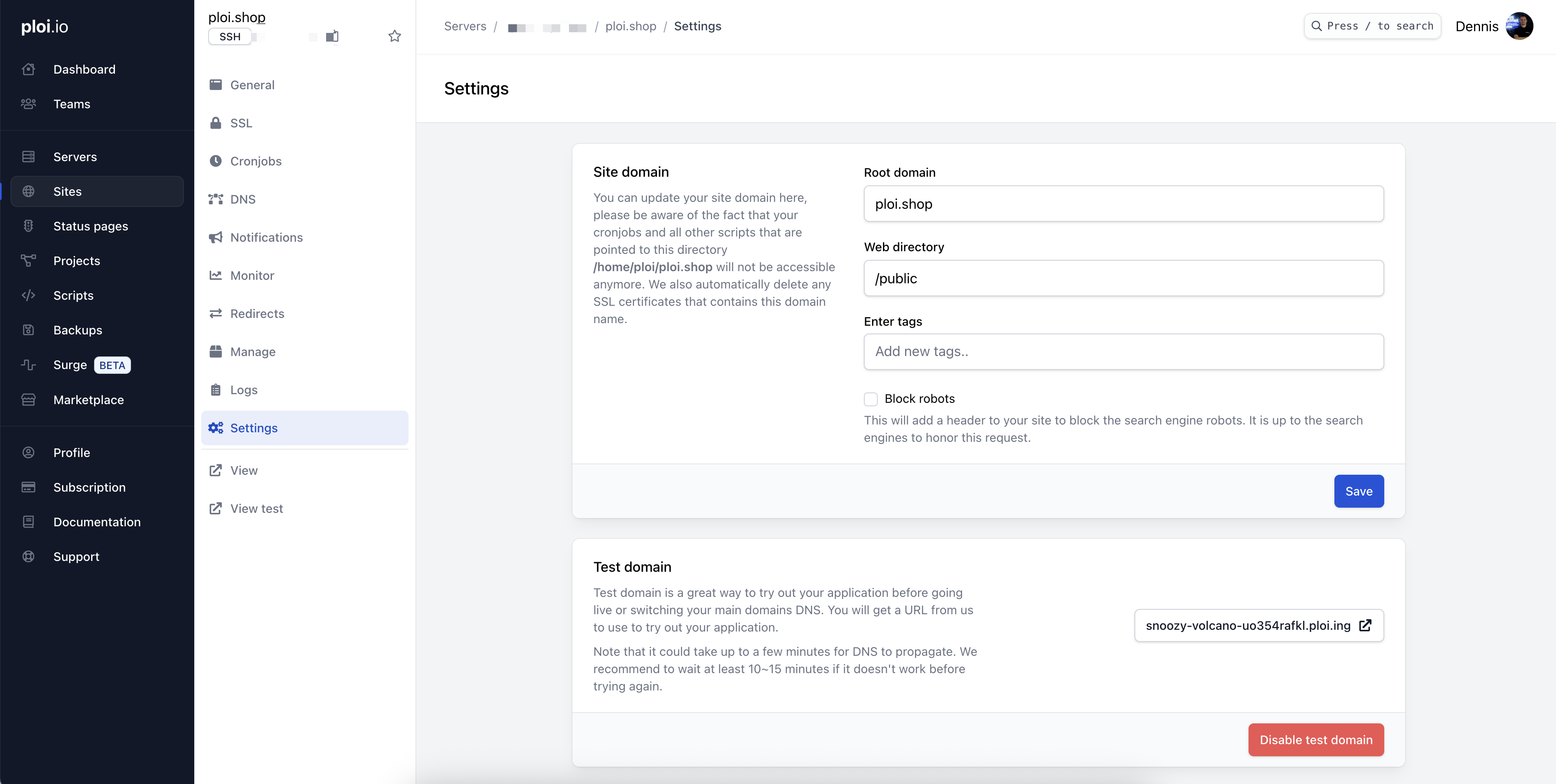 The Testing Domain feature in Ploi allows you to test your sites on a temporary Ploi-provided domain before going live with your own domain. This is particularly useful when you want to verify your site configuration, test SSL functionality, or preview your site before pointing your DNS records to Ploi.