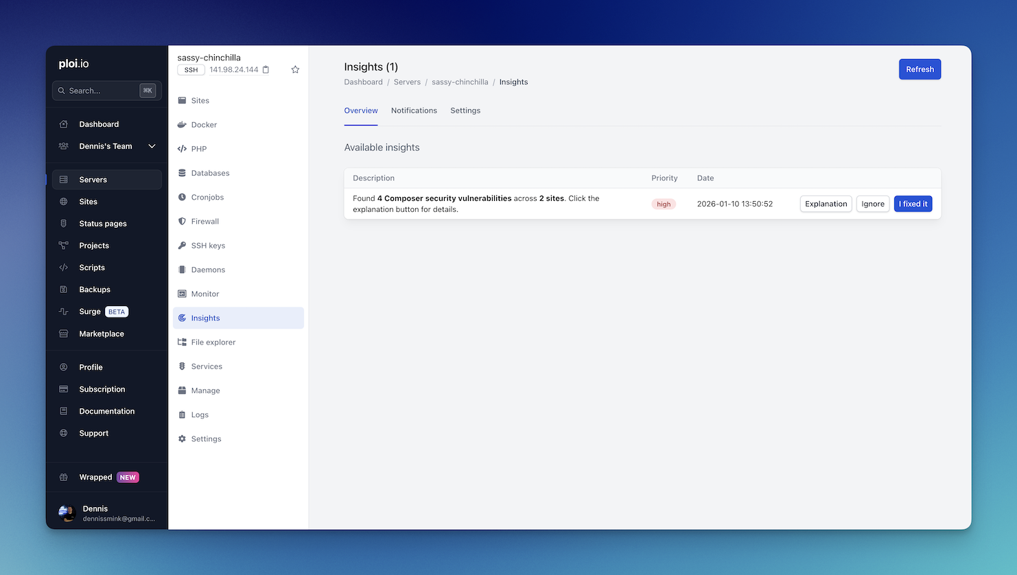 For older servers (created before 2025), Ploi parses your composer.lock and checks packages against the PHP Security Advisories database