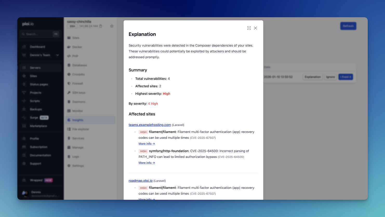 This insight automatically scans the Composer packages across all your sites and checks them against known security vulnerabilities. If any of your dependencies have reported CVEs, you'll see them appear in your insights dashboard with details about the affected package, severity, and recommended actions.